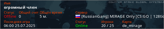 Играет на Counter Strike Global Offensive сервере. Страна: РоссияПервый раз замечен 05:36 25.07.2025