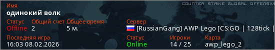 Играет на Counter Strike Global Offensive сервере. Страна: РоссияПервый раз замечен 15:59 08.02.2026