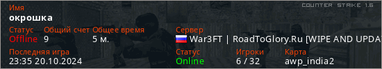 Играет на Counter Strike 1.6 сервере. Страна: РоссияПервый раз замечен 23:33 20.10.2024