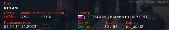 Играет на Counter Strike Source сервере. Страна: РоссияПервый раз замечен 14:38 13.02.2021
