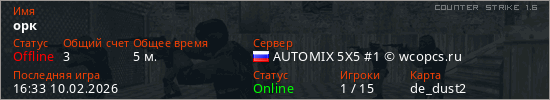 Играет на Counter Strike 1.6 сервере. Страна: РоссияПервый раз замечен 16:31 10.02.2026