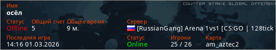 Играет на Counter Strike Global Offensive сервере. Страна: РоссияПервый раз замечен 12:03 26.02.2026