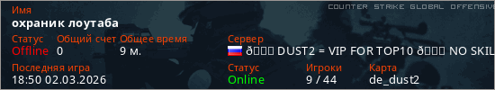 Играет на Counter Strike Global Offensive сервере. Страна: РоссияПервый раз замечен 20:24 23.08.2025