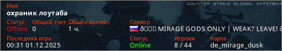 Играет на Counter Strike Global Offensive сервере. Страна: РоссияПервый раз замечен 12:48 04.09.2025