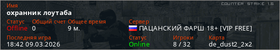 Играет на Counter Strike 1.6 сервере. Страна: РоссияПервый раз замечен 14:32 08.03.2026