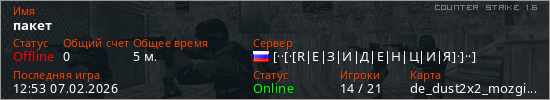 Играет на Counter Strike 1.6 сервере. Страна: РоссияПервый раз замечен 12:51 07.02.2026