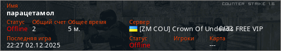 Играет на Counter Strike 1.6 сервере. Страна: УкраинаПервый раз замечен 22:02 02.12.2025