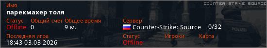 Играет на Counter Strike Source сервере. Страна: РоссияПервый раз замечен 17:09 02.03.2026