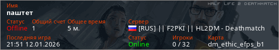 Играет на Half Life 2 DeathMatch сервере. Страна: РоссияПервый раз замечен 21:39 12.01.2026