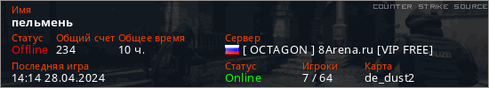 Играет на Counter Strike Source сервере. Страна: РоссияПервый раз замечен 14:54 12.05.2020