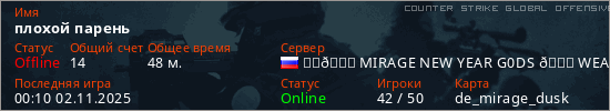 Играет на Counter Strike Global Offensive сервере. Страна: РоссияПервый раз замечен 08:10 18.02.2025