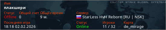 Играет на Counter Strike Global Offensive сервере. Страна: РоссияПервый раз замечен 16:42 02.02.2026