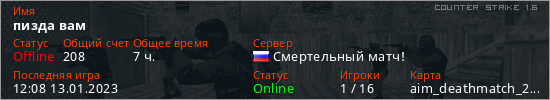 Играет на Counter Strike 1.6 сервере. Страна: РоссияПервый раз замечен 14:03 05.01.2023