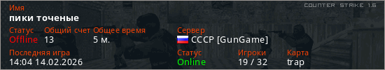 Играет на Counter Strike 1.6 сервере. Страна: РоссияПервый раз замечен 14:02 14.02.2026