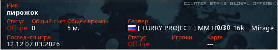 Играет на Counter Strike Global Offensive сервере. Страна: РоссияПервый раз замечен 12:10 07.03.2026