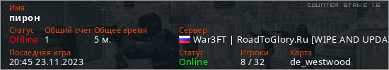 Играет на Counter Strike 1.6 сервере. Страна: РоссияПервый раз замечен 20:41 23.11.2023