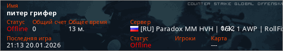 Играет на Counter Strike Global Offensive сервере. Страна: РоссияПервый раз замечен 16:31 19.01.2026