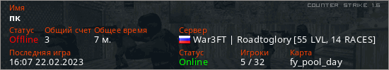 Играет на Counter Strike 1.6 сервере. Страна: РоссияПервый раз замечен 16:03 22.02.2023