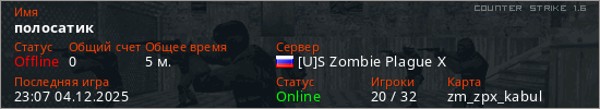 Играет на Counter Strike 1.6 сервере. Страна: РоссияПервый раз замечен 23:05 04.12.2025