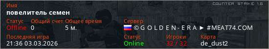 Играет на Counter Strike 1.6 сервере. Страна: РоссияПервый раз замечен 21:12 03.03.2026