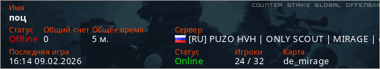 Играет на Counter Strike Global Offensive сервере. Страна: РоссияПервый раз замечен 15:12 09.02.2026