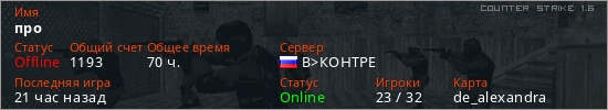 Играет на Counter Strike 1.6 сервере. Страна: РоссияПервый раз замечен 00:48 14.11.2019