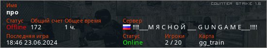 Играет на Counter Strike 1.6 сервере. Страна: РоссияПервый раз замечен 21:12 08.05.2022