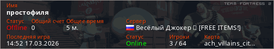 Играет на Team Fortress 2 сервере. Страна: РоссияПервый раз замечен 14:49 17.03.2026
