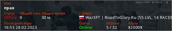 Играет на Counter Strike 1.6 сервере. Страна: РоссияПервый раз замечен 09:08 26.02.2023