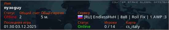Играет на Counter Strike Global Offensive сервере. Страна: РоссияПервый раз замечен 00:50 03.12.2025