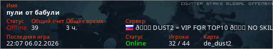 Играет на Counter Strike Global Offensive сервере. Страна: РоссияПервый раз замечен 21:21 05.03.2025