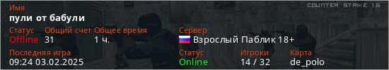 Играет на Counter Strike 1.6 сервере. Страна: РоссияПервый раз замечен 10:06 01.07.2023
