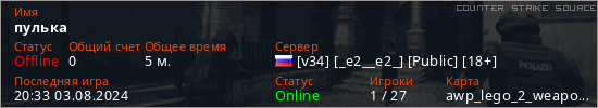 Играет на Counter Strike Source сервере. Страна: РоссияПервый раз замечен 20:31 03.08.2024