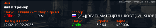 Играет на Counter Strike Source сервере. Страна: РоссияПервый раз замечен 15:19 18.02.2026