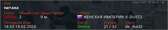Играет на Counter Strike 1.6 сервере. Страна: РоссияПервый раз замечен 20:49 25.01.2026