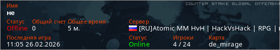 Играет на Counter Strike Global Offensive сервере. Страна: РоссияПервый раз замечен 10:57 26.02.2026