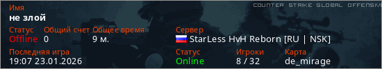 Играет на Counter Strike Global Offensive сервере. Страна: РоссияПервый раз замечен 12:44 22.01.2026