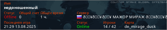 Играет на Counter Strike Global Offensive сервере. Страна: РоссияПервый раз замечен 15:40 01.08.2025