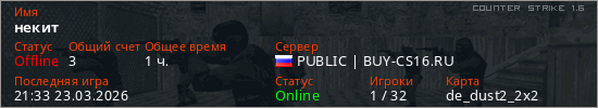 Играет на Counter Strike 1.6 сервере. Страна: РоссияПервый раз замечен 20:00 10.03.2026