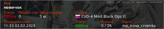 Играет на Call of Duty 4: Modern Warfare сервере. Страна: РоссияПервый раз замечен 11:31 02.02.2025