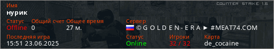 Играет на Counter Strike 1.6 сервере. Страна: РоссияПервый раз замечен 06:55 24.04.2023