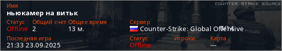 Играет на Counter Strike Source сервере. Страна: РоссияПервый раз замечен 10:07 22.09.2025