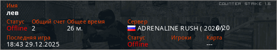 Играет на Counter Strike 1.6 сервере. Страна: РоссияПервый раз замечен 21:42 26.12.2025