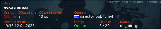 Играет на Counter Strike Global Offensive сервере. Страна: РоссияПервый раз замечен 17:01 10.04.2026