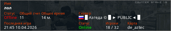 Играет на Counter Strike 1.6 сервере. Страна: РоссияПервый раз замечен 20:04 07.04.2026