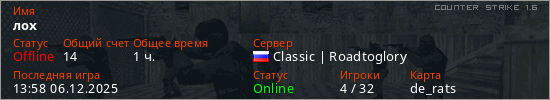 Играет на Counter Strike 1.6 сервере. Страна: РоссияПервый раз замечен 11:21 19.01.2025
