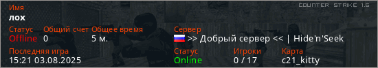 Играет на Counter Strike 1.6 сервере. Страна: РоссияПервый раз замечен 15:15 03.08.2025
