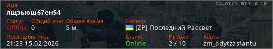Играет на Counter Strike 1.6 сервере. Страна: УкраинаПервый раз замечен 20:49 15.02.2026