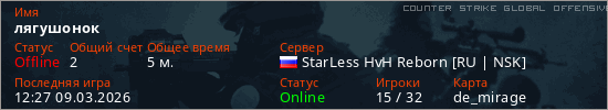 Играет на Counter Strike Global Offensive сервере. Страна: РоссияПервый раз замечен 12:19 09.03.2026