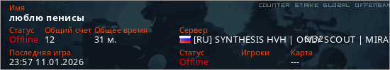 Играет на Counter Strike Global Offensive сервере. Страна: РоссияПервый раз замечен 17:34 08.01.2026